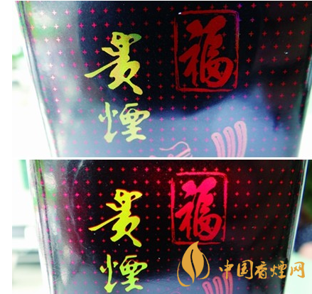 商標(biāo)紙印刷工藝差異對(duì)比:真品小盒正面商標(biāo)紙“貴煙”燙金由無(wú)數(shù)的網(wǎng)格狀組合而成;假煙小盒正面商標(biāo)紙“貴煙”字體普通仿造印刷而成,與真品商標(biāo)紙印刷工藝存在明顯差異。