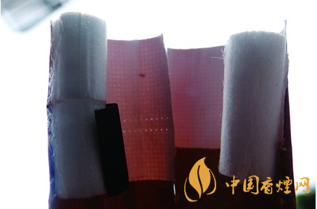 煙支濾嘴棒及降焦打孔差異比對:真品煙支濾嘴棒采用新型降焦“二元復合炭紙過濾嘴棒”,長度24(12+12)mm兩段式組合,接裝紙上有兩排降焦打孔;假煙濾嘴棒采用單一丙纖材質的濾嘴,長度只有19mm,接裝紙上無任何打孔,無法達到物理降焦效果,與真品工藝特征存在明顯差異。