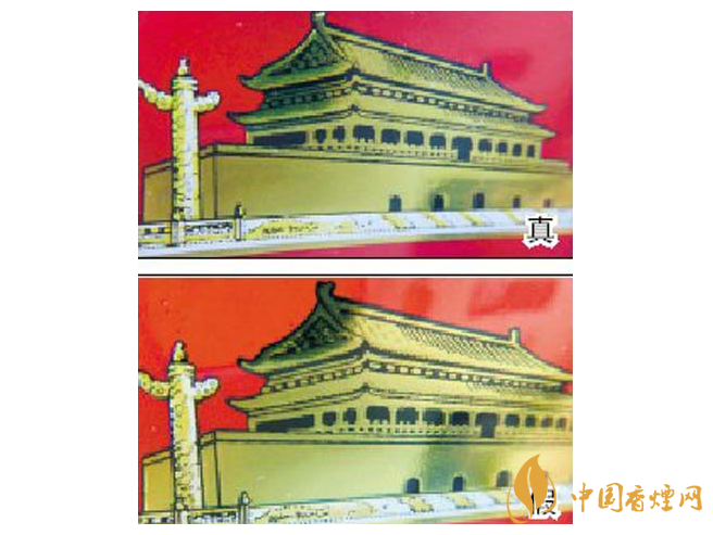1.小盒正面商標(biāo)紙?zhí)咨珷C金工藝對(duì)比:真煙天安門左側(cè)華表套色均勻,黃白色分布有明顯分界點(diǎn),邊緣光滑、干凈、清晰;假煙套色較差,黃白色不明顯,黃色部分印刷較分散,字體邊緣套印有毛渣點(diǎn),呈現(xiàn)鋸齒狀。